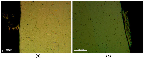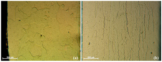Through optical microscopy, a metallographic analysis was performed on the tested samples. Figure 7 sets out two micrographs obtained after threating the samples via Barker electrochemical etching. However, this analysis did not highlight any detail about the microstructure, which could be relevant or have influence on the generation of defects. Indeed, at the grain boundaries no secondary phase or trace of segregation phenomena is present [28].
