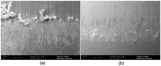 Furthermore, a SEM-SE morphological analysis wasperformed, to qualitatively assess the differences between the different mold cooling methodologies. The most interesting results concerned billets extruded with the same working parameters. In Figure 9, the junction areas of billets 5-2 (air cooled dye) and 25-4 (liquid nitrogen cooled die) are displayed in detail. Compared to the 25-4 sample, the 5-2 specimen showed much larger defects and a large quantity of the material adhered onto the surface.