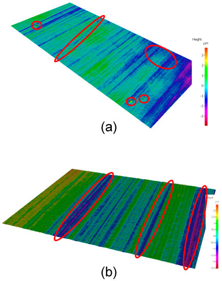 Surface roughness maps. The surface of the conventionally extruded semi-product (a) is featured by peak-like defects emerging from the surface. The surface of the liquid nitrogen cooled specimen (b) features the presence of valleys along the extrusion direction.