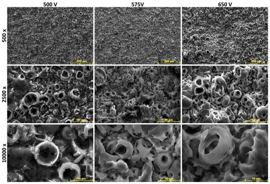 In Figure 1, the SEM images of porous coatings obtained on CP Titanium Grade 2 after PEO treatment at voltages of 500 VDC, 575 VDC and 650 VDC, are presented. It can be observed that the voltage increase results in a change in surface morphology, as well as pore shapes and sharpness. Due to the fact that, on the basis of SEM images, it was not possible to differentiate the surfaces of the obtained PEO coatings, 3D roughness parameters were used to describe them, and are presented in Table 2.