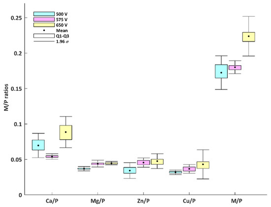EDS results as Ca/P, Mg/P, Zn/P, Cu/P and M/P (M = Ca + Mg + Zn + Cu) ratios measured for coatings formed on CP Titanium Grade 2 after PEO process at the voltages 500 VDC, 575 VDC, 650 VDC in 1 L of 85% H3PO4 with additions of 125 Ca(NO3)2·4H2O, 125 g Mg(NO3)2∙6H2O, 125 g Zn(NO3)2∙6H2O, and 125 g Cu(NO3)2∙3H2O.
