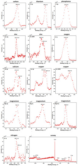 XPS spectra of coatings formed on CP Titanium Grade 2 after PEO process at voltage 575 VDC in 1 L of 85% H3PO4 with additions of 125 g Ca(NO3)2·4H2O, 125 g Mg(NO3)2∙6H2O, 125 g Zn(NO3)2∙6H2O, and 125 g Cu(NO3)2∙3H2O.