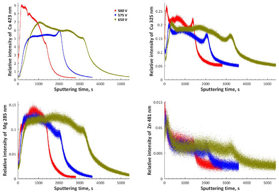GDEOS (Glow Discharge Optical Emission Spectroscopy) signals of calcium (Ca), magnesium (Mg), copper (Cu) and zinc (Zn) of coatings formed on CP Titanium Grade 2 after PEO process at voltages 500 VDC, 575 VDC, 650 VDC, in 1 L of 85% H3PO4 with the additions of 125 g Ca(NO3)2·4H2O, 125 g Mg(NO3)2∙6H2O, 125 g Zn(NO3)2∙6H2O, and 125 g Cu(NO3)2∙3H2O.
