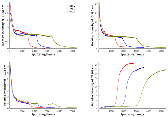 GDEOS signals of phosphorus (P), oxygen (O), hydrogen (H) and titanium (Ti) of coatings formed on CP Titanium Grade 2 after PEO process at voltages 500 VDC, 575 VDC, 650 VDC, in 1 L of 85% H3PO4 with the additions of 125 g Ca(NO3)2·4H2O, 125 g Mg(NO3)2∙6H2O, 125 g Zn(NO3)2∙6H2O, and 125 g Cu(NO3)2∙3H2O.