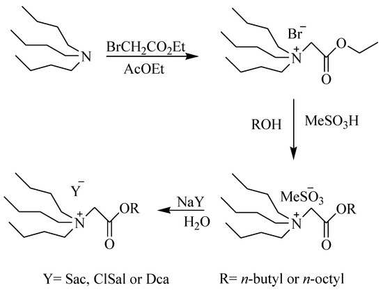 In the second step, the strategy used for the esterification reaction is to perform the reaction without any additional solvent; alcohol was also considered as solvent. Methanesulfonic acid was selected as reaction catalyst. It is the best candidate for a green synthesis route, often recyclable and less aggressive than conventional acids [35]. Anionic metathesis between the ester formed and sodium saccharinate, sodium dicyanamide and sodium chlorosalicylate is carried out in water and led in all cases to the formation of hydrophobic ILs with a good yield (˃78%). All the ILs are viscous liquids at room temperature.