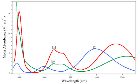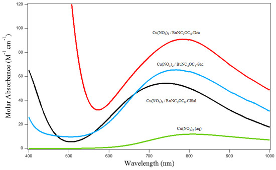 The coordination of metal in the IL phases was investigated on the basis of the spectrophotometric analysis of the ionic liquid phase after extraction of Co.(II), Cu(II) and Ni(II). The electronic spectra of Ni(II) in BuNC2OC8-ClSal are characteristic to Ni(II) in an octahedral environment (Figure 4). The two bands with the λmax located at 1145 and 700 nm are assigned to the 3A2g → 3T2g and 3A2g → 3T1g (F) transitions, respectively [38]. A third band with the λmax located around 400 nm and partially masked by an intense transfer charge band is attributed to a 3A2g → 3T1g (P) transitions. The spectrum is shifted to weaker energy by comparison to the spectrum of Ni(H2O)62+ in aqueous solutions. This evidences the coordination of Ni(II) by oxygen atoms of the ClSal anion.