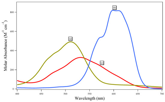 Figure 6. UV-Vis spectra of Co.(NO3)2 in (a) BuNC2OC8-Dca phase; (b) aqueous phase step up 100 times and; (c) BuNC2OC8-ClSal phase step up 10 times. Cmetal = 0.05 mol L−1; Vw = 2 mL; mIl = 0.5 g; UV-vis spectra are recorded in ethylacetate for IL phase