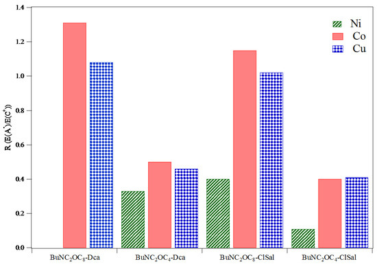 Ion-pairing is the dominant mechanism with BuNC2OC8+ cation. Indeed, for all systems, except for Cu(II)/BuNC2OC8-ClSal, the ratio E(A)/E(C+) values are close and even may exceed 1 (Figure 7). A value higher than 1 means that the anions of the metal salt are more efficiently extracted than metal itself and suggests the possibility of anion exchange between the anion of the ionic liquid and the nitrate ions. This may take place during the extraction of Co.(II) in BuNC2OC8-Dca (R = 1.3) and to a small extent with BuNC2OC8-ClSal (R = 1.1).