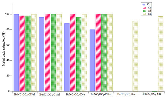 Figure 8 shows that EDTA is an efficient ligand to recover metal ions from the ionic liquid phase. Cu(II) is back extracted from BuNC2OCn-Clsal with recovery percentages close to 100% and higher than 80% with BuNC2OCn-Dca. The efficiency is observed for the recovery of Ni(II) Cd(II) and Co.(II) from these two ionic liquids. Cd(II) is also fully back extracted from BuNC2OCn-Sac with a back extraction percentage exceeding 90%.