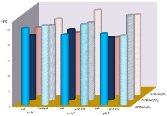 After the back-extraction process, it is important to check if the ionic liquid would be able to be reused for the extraction of metal from aqueous solution. To check the recyclability of the ionic liquids, several cycles of extraction-back extraction were carried-out on the same ionic liquid phase, following the same experimental conditions as those reported previously.