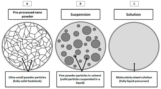 SPPS offers a single-step deposition process of finely-structured cermet coatings by employing molecularly-mixed liquid precursors directly as the feedstock, which enables avoiding the powder and suspension preparation as shown in Figure 1 [10,13,14,17,18,19]. The use of solution precursors for thermal spraying was initiated by Karthikeyan et al. [21]. SPPS coating technology is industrially advantageous due to its ease in feedstock preparation.