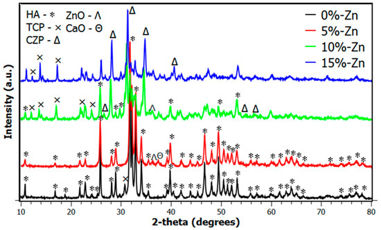 X-ray diffraction diagram of the Zn-doped HA cermet coatings showing the evolution of the calcium zinc phosphate phase as zinc ion concentration increases. Reproduced with permission from [13], Elsevier, 2018.