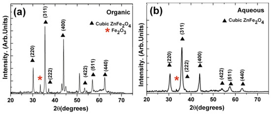 X-ray diffraction spectra of deposited zinc ferrite films using (a) ethylene glycol, and (b) water as precursor solvents. Reproduced with permission from [10], Elsevier, 2012.