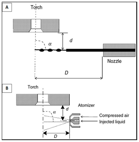 The mechanism of solution injection into the plasma jet affects the heating of the droplets. The solution inside a pressurized container can be fed using a pneumatic system or in an open container using a peristaltic pump. The flow rate can be easily adjusted by varying the pressure or rotation of the roller, respectively. In general, clogging is not a problem in SPPS, unlike in the APS process. However, a flexible pipeline must be used and flushing the injector with ethanol or water is recommended to avoid gelling of the solution inside the injector. The types of injection that are frequently used in SPPS can be categorized depending on the type of injector used (mechanical or atomizing injector), the mode of injection (internal or external) and, on the choice between radial and axial injection setup [17,23,30,31]. The solution inside a pressurized container can be fed using a pneumatic system or in an open container using a peristaltic pump, as shown in Figure 5.