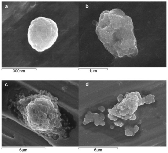 Figure 9a shows deposited melted or partially melted spherical particles (~0.3 µm in diameter), which resulted from the evaporation of solvent at the surface of the small droplets [33,35,41]. The small sintered particles (~1 µm) are like the melted ones, but deposited before melting occurs, as shown in Figure 9b [33,35,37,41]. These small particles could have stuck together forming agglomerates as it reaches the substrate, as shown in Figure 9c. Such particles are the major deposit elements of the coating microstructure which contributes to the small pores in the coating [41]. The large pores in coatings due to the stacking of irregularly shaped agglomerates, such as dome-like ones, are shown in Figure 10 [39].