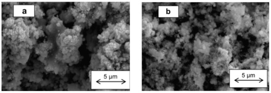 Additionally, Nishida (2009) reported that the addition of nickel particles into samaria-doped ceria modifies the microstructure of coating from including only spherical particles into the one with nano-spheres with embedded nanoparticles to be used in SOFC applications [43]. A porous microstructure with porosity in the form of interconnected networks of voids was observed for cermet coatings produced from an aqueous solution precursor [29]. The void in the coating’s architecture is a result from the decomposition of the partially pyrolyzed precursor which is submitted to in situ evaporation of the remaining solvent [44]. Figure 13 displays the surface morphology of the LSM cermet coating deposited using (Figure 13a) water and (Figure 13b) ethanol as solvents. The aqueous SPPS coating shows a porous sponge-like morphology with agglomerated solid (~0.5 µm) particles. On the other hand, ethanol SPPS coating shows similar porous morphology and agglomerated solid particles, but with the refinement of particle size (~0.2 µm) which attributed the increase of the triple phase boundary length between the YSZ and LSM cathode, decreasing cathode polarization.