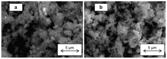 As discussed in the previous sections, the chemistry of the initial precursors influences the microstructure of the final cermet coatings, as depicted in Figure 14, showing the SEM images of nickel-based cermets (a) Ni-YSZ and (b) Ni-SDC. Nickel-samaria-doped ceria (Ni-SDC) coating displays a microstructure composed of very fine spherical particles having micrometer and nanometer sizes similar to nickel-yttria-stabilized zirconia. The morphology of nickel particles in SPPS was already reported to be very fine, which suggests that its combination with samaria-doped ceria (SDC) does not promote the growth acceleration of the particles [26].