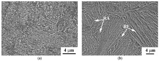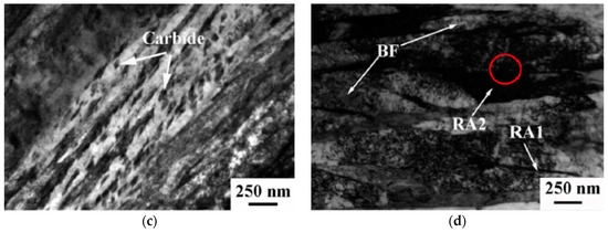 SEM and TEM micrographs [5]: (a,c) refer to the carbide-bearing lower bainite; (b,d) refer to the carbide-free lower bainite (RA: Retained austenite; BF: Bainitic ferrite). Reproduced from [5], with permission from publisher Elsevier, 2018.