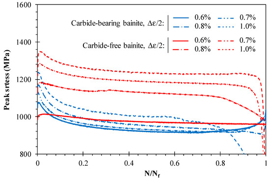 - The maximum stress amplitudes, under strain-controlled conditions, are observed in the early cycles of the tests for life ratios lower than 1%, irrespective of the strain amplitude. Regarding the ratios of the initial stress amplitude to the maximum stress amplitude, it can be noted that the responses of both steels are similar, with ratios close to 1—or more precisely, 0.93 and 0.97 for the carbide-bearing lower bainite and carbide-free lower bainite, respectively;