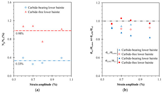 The maximum stress occurs in the early cycles of the tests. The life ratios of these values, designated here by Np/Nf, are represented in Figure 3a for the tested steels. As can be seen in the figure, although some scatter is observed, there is a clear trend for each case. The maximum stress amplitudes are attained faster for the carbide-bearing lower bainite than for the carbide-free lower bainite, and the Np/Nf values are, on average, equal to 0.33% (see the dashed line) and 0.98% (see the dash-dotted line) of the life ratio, respectively.
