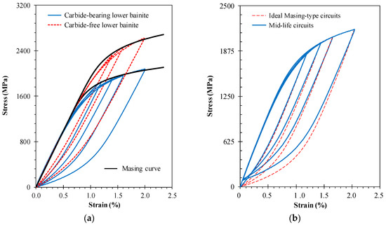 The study of the cyclic stress-strain response for both tested materials, was performed on the basis of the data being collected for the mid-life cycle [15,16,17]. Total plastic and elastic strain amplitudes, stress amplitudes, and plastic strain energy densities of the selected hysteresis loops are listed in Table 1. Figure 4a plots the mid-life stress-strain circuits of the carbide-bearing and carbide-free bainitic steels in relative coordinates, with the lower tips tied together at different strain amplitudes. When first looking, it can be concluded that the upper branches are not perfectly coincident, and that we are therefore in the presence of non-Masing type materials. A more in-depth analysis for the carbide-bearing bainitic steel is provided in Figure 4b, which compares perfect Masing-type circuits (dashed lines) with those that were obtained in the experiments (full lines) in relative coordinates, with the upper branches overlapped. Not surprisingly, it is possible to distinguish a reduction of the linear region where, the higher the strain amplitudes, the bigger the differences. The comparison of the mid-life circuits shows that the areas—or in other words, the plastic strain energy densities—are larger for the carbide-bearing lower bainite than for the carbide-free lower bainite (see Table 1) at similar strain amplitude levels.