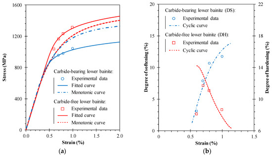 (a) Cyclic stress-strain curve; (b) variation of the degree of softening and the degree of hardening for the carbide-bearing and carbide-free bainitic steels.