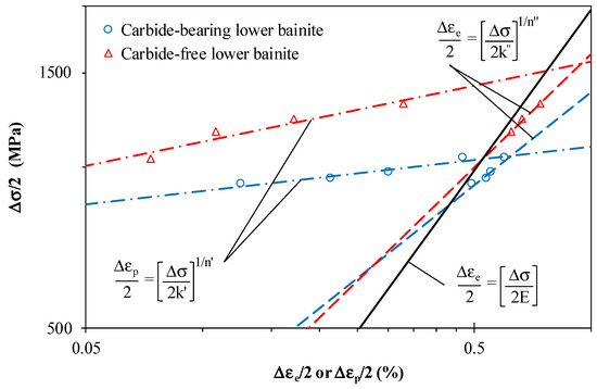 where σf’ is the fatigue strength coefficient, and b is the fatigue strength exponent. The constants, determined via the least square method, are reported in Table 5. In both cases, but particularly for the carbide-bearing lower bainite, a significant correlation between the experiments and the proposed functions was obtained [5]. As already noted by Long et al. [5], the carbide-free bainite can deal with higher stress amplitudes for a similar number of cycles, particularly for lower fatigue lives. As the fatigue life increases, the differences tend to be attenuated.