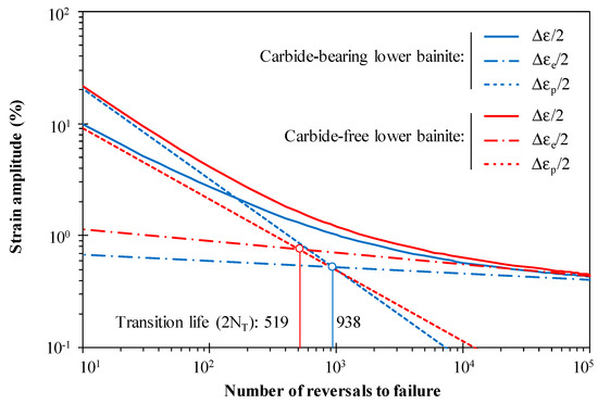 where σf’ is the fatigue strength coefficient, b is the fatigue strength exponent, εf’ is the fatigue ductility coefficient, and c is the fatigue ductility exponent. Figure 7 presents the strain-life relations of the carbide-bearing and the carbide-free steels that were obtained from the experiments. The constants, fitted using the least square method, are reported in Table 5, where the experimental data that was collected in the tests were omitted for the sake of clarity. Overall, the fatigue resistance of the carbide-bearing lower bainite is smaller than that of the carbide-free lower bainite. As suggested by Long et al. [5], fatigue durability is negatively affected by the stable carbides and thick bainite ferrite plates and, on the contrary, the existence of fine bainite ferrite plates and metastable retained austenite positively affects the fatigue performance. The difference between the two tested steels is the greatest for lower lives, and tends to disappear as the strain amplitude decreases. For lives greater than 104, the total strain versus life curves tend to be overlapped. Regarding the transition lives, represented by 2NT in Figure 7, the outcomes are also notoriously different: 2NT of the carbide-bearing lower bainite is two times higher than that of the carbide-free lower bainite.