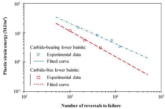Figure 8 plots the plastic strain energy density that was evaluated from the mid-life hysteresis loops against the number of cycles to failure for the carbide-bearing and carbide-free bainitic steels. In a log-log scale, the relationship between these variables can be described by a straight line, i.e.,