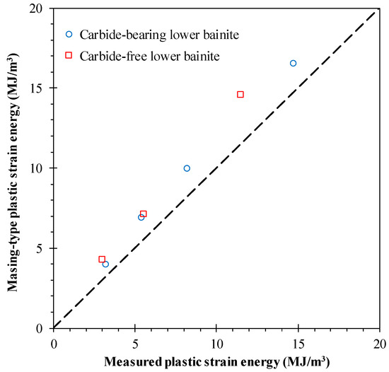 where Δεp is the plastic strain range, Δσ is the stress range, and n’ is the cyclic hardening exponent. The experimentally measured values (ΔWp) are relatively far from those of the Masing-type materials (ΔWpM) for both the carbide-bearing and carbide-free bainitic steels, and the differences increase with the strain amplitude, irrespective of the tested steel. This outcome is in line with the conclusions drawn from Figure 4.