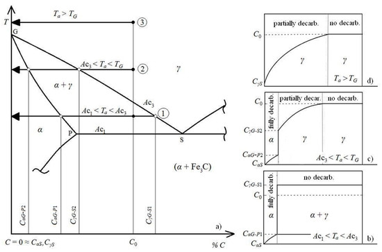 The decarburization of steel during annealing is an isothermal process that causes a decrease in the content of carbon in the surface layer. Meanwhile, during the isothermal annealing at T < TG (912 °C) there is also a change in the microstructure of the steel’s surface. From a microstructural point of view and with respect to the annealing temperature Ta, the decarburization of the surface at T > AC1 can be divided into three temperature ranges (Figure 1a): AC1 < Ta < AC3 (arrow 1), AC3 < Ta < TG (arrow 2) and Ta > TG (arrow 3).