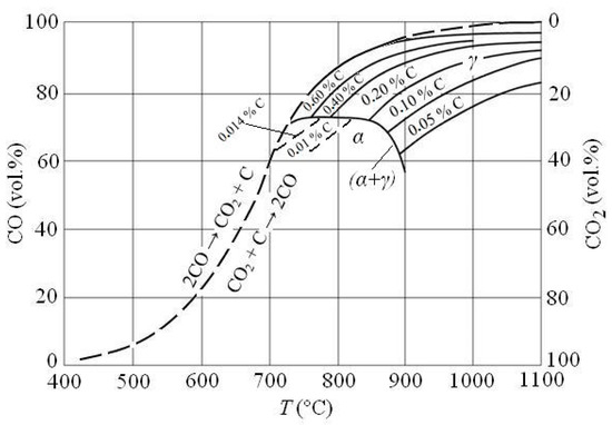 Carbon reacts with oxygen creating CO and CO2 during the annealing of the steel in air. The reactions of the direct oxidation of carbon with oxygen (C + O2 → CO2 and 2C + O2 → 2CO; Figure 2) intersect at T ≈ 700 °C. The lines of both reactions show that at T > 700 °C CO is more stable or that CO is preferentially formed at T > AC1. This means that, with respect to the Boudouard equilibrium (C + CO2 ↔ 2CO, Figure 2), the reaction goes from left to right at T > 700 °C [12,17] or that there is a tendency towards decarburization at T > AC1. Because an increasing temperature means that the carbon preferentially burns to form CO, the equilibrium content of CO in the formed gas mixture also increases (Figure 4). The equilibrium content of carbon in austenite at the annealing temperature, based on the composition of the atmosphere in the furnace, is shown with lines that are moved to the right of the Boudouard equilibrium at T > AC1 (Figure 4). A curve from which the lines of the equilibrium carbon concentration in austenite are coming out is the equilibrium between the austenite and the ferrite in the two-phase region (α + γ), and under this line the equilibrium amount of carbon in ferrite is present. It is important to know that gas mixtures (CO + CO2) cause the decarburization of steel if their composition is below or to the right of the equilibrium line for that steel, while they cause carburization if their composition is above or to the left of that line.