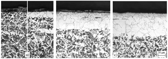 Microstructure of the surface part of C45 steel after annealing at Ta = 950 °C. (a) ta = ½ h, (b) ta = 1 h, (c) ta = 2 h.