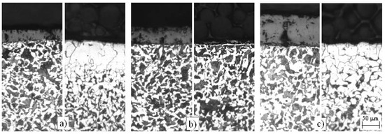 A clearly visible ferrite layer is formed on the surface as a consequence of the decarburization. Under it there is no visible, partially decarburized layer (see the explanation in Section 2.1). The decarburized layer is discontinuous after short annealing times. There is practically no decarburization on the surface after ta = ½ h (Figure 6a-left) and there was only a very locally limited small decarburization area found. The ferrite in this area could have easily been mistaken for a local banded distributed untransformed ferrite in steel, but the ferrite grains in a surface decarburized layer are more polygonal shape (Figure 6a-right). After ta = 1 h the surface is already strongly decarburized (Figure 6b), part of the decarburized surface is large, while there are still larger areas of surface that did not yet decarburize (here the state is the same as that in Figure 6a-left). After ta = 2 h, there is a continuous decarburized ferrite layer on the surface (Figure 6c). The measured maximum thicknesses of the decarburized layers after different annealing times are: 50 μm (ta = ½ h), 120 μm (ta = 1 h) and 150 μm (ta = 2 h).