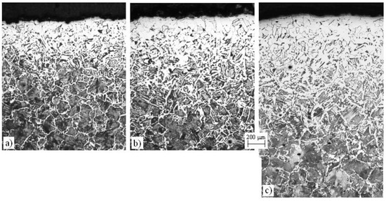 The whole surface is decarburized and the decarburized layer is clearly visible (Figure 9). On the surface there is a predominantly ferrite layer. Under this predominantly ferrite layer, the ferrite content continuously decreases with depth, while a higher content of intergranular ferrite shows a more intense diffusion of carbon along the austenite grain boundaries. The steel is strongly overheated, which is shown by the coarse pearlite grains and by the coarse Widmanstätten ferrite microstructure of the partially decarburized layer. The measured maximum thicknesses of the decarburized layers are: 650 μm, including a 200-μm-thick predominantly ferrite layer (ta = ½ h); 1000 μm, including a 260-μm-thick predominantly ferrite layer (ta = 1 h); and 1400 μm, including a 300-μm-thick predominantly ferrite layer (ta = 2 h).