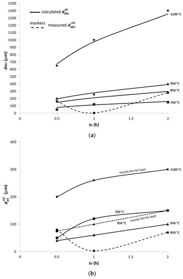 The depth of the theoretically still-acceptable decarburization 0.884 for C45 steel with C0 = 0.43 wt % is therefore the minimum thickness required to be cut off after annealing in steady air, which should still ensure the lowest acceptable hardness of the surface of C45 steel after the correct quenching. The measured , and the theoretical decarburization depths , 0.884 are presented in Table 2, while the relations of the visible thicknesses of the decarburization related to the annealing time and temperature are graphically shown in Figure 10.