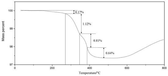 The 3D-printed Fe-based metallic glass parts were placed in a drying box and dried at 60 °C for 3 h, 30 °C for 9 h, and ambient temperature for 24 h. The thermogravimetric analysis (TGA) is shown in Figure 1. The organic decomposition is divided in four steps and the mass losses at these steps are 0.17%, 1.12%, 0.81%, and 0.64%, respectively. Based on the TGA, the debinding schedule was increased to 350 °C at a rate of 3 °C/min and held for 20 min, then increased to 390 °C at 3 °C/min and held for 20 min, and finally increased to 450 °C at 3 °C/min and held for 20 min; at this time, the debinding amount was the closest to the proportion of organic matter.