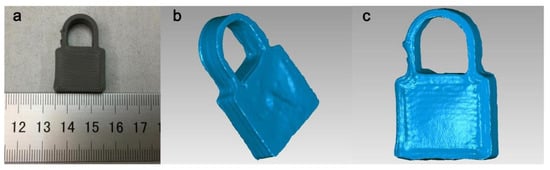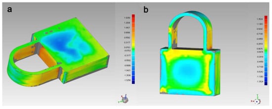 The lock-shaped part printed in this study is shown in Figure 2a. Three-dimensional scanning of the printed and sintered lock-shaped parts was performed, and the reconstructed three-dimensional model is presented in Figure 2b,c. Deformation analysis of the printed and sintered parts was performed by comparing the reconstructed 3D models with the original CAD model, and the results are presented in Figure 3a,b, respectively. For the lower half of the printed part, the deformation in the central part was larger than that of the two sides, and the deformation was mainly sunken; in contrast, for the upper half, the deformation of the two sides was larger than that of the central part, and the deformation was mainly bulging. The maximum bulging and sunken deformations were 1.525 mm and 1.4691 mm, respectively, and the average bulging and sunken deformations were 0.256 mm and 0.2283 mm, respectively. The standard deviation of the deformation was 0.3387 mm. These results confirm the good printing accuracy of the pneumatic injection additive manufacturing system. The deformation of the sintered part was reduced compared with that of the printed part. The maximum bulging and sunken deformations were 1.3524 mm and 1.1405 mm, respectively, and the average bulging and sunken deformations were 0.1959 mm and 0.2405 mm, respectively. The standard deviation of the deformation was 0.2791 mm.