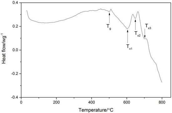 The results of the DSC test are presented in Figure 4. The Fe-based metallic glass powders underwent an obvious endothermic reaction during the heating process as well as glass transition and crystallization processes. Clear steps are observed in the DSC curve at 501 °C, and a clear endothermic peak appeared before the exothermic peak. The glass transition temperature was 501 °C. After the glass transition, three consecutive exothermic peaks appeared at 602 °C, 647 °C, and 702 °C. These peaks indicate that during the heating process, the crystallization of the Fe-based metallic glass occurred in three stages. After that, the material transformed from a supercooled state to a stable crystalline phase. The glass transition temperature of the Fe-based metallic glass was Tg = 501 °C, the first crystallization temperature was T×1 = 602 °C, the second crystallization temperature was T×2 = 647 °C, and the third crystallization temperature was T×3 = 702 °C.