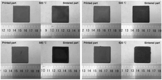 To determine the effect of the sintering temperature on the properties of the 3D-printed Fe-based metallic glass parts, sintering of 3 cm × 3 cm square sheets was performed at 500 °C, 540 °C, 580 °C, and 620 °C with a holding time of 1 h. The changes of the printed parts after sintering are shown in Figure 5. For the sintering temperature of 500 °C, the central part of the sintered parts was undersintered because of the low sintering temperature. For the sintering temperature of 620 °C, more pores were formed on the surface of the sintered parts and bad warpage occurred. For sintering temperatures of 540 °C and 580 °C, the surface quality of the sintered parts was improved.