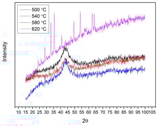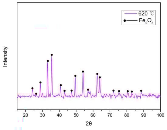 X-ray diffraction was used to analyze the crystallization degree of the sintered parts at different sintering temperatures using a scanning step size of 0.1° in the 2θ range of 15–100°. The XRD (X-ray diffraction) patterns are presented in Figure 6. For sintering temperatures of 500 °C, 540 °C, and 580 °C, the XRD patterns of the sintered parts consisted of broad and diffuse diffraction peaks, and a broader halo around 43° is observed, indicating that the sintered parts almost were not crystallized []. The sintering temperature of 620 °C has long-range periodicity and sharp diffraction peaks between 25° and 70°, indicating that the sintered parts were crystallized. The phase analysis is shown in Figure 7, and illustrates that the crystalline phase was mainly Fe2O3. This is mainly because the crystalline Fe was precipitated with the increased sintering temperature and then reacted with O2.