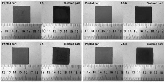 To investigate the effect of the holding time on the properties of the 3D-printed Fe-based metallic glass parts, sintering of 3 cm × 3 cm square sheets was performed at 580 °C for holding times of 1, 1.5, 2, and 2.5 h. The effect of the holding time is shown in Figure 10. For the holding time of 2 h, more pores were observed on the surfaces of the printed parts in addition to slight warpage. For holding times of 1, 1.5, and 2.5 h, the surface quality of the sintered parts was better.