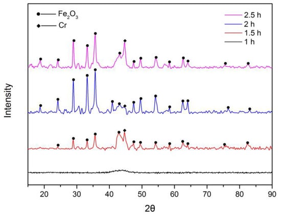 X-ray diffraction was used to analyze the crystallization degree of the sintered parts at different holding times using a scanning step size of 0.1° in the 2θ range of 15–90°. The results are presented in Figure 11. For a holding time of 1 h, the XRD patterns of the sintered parts consisted of broad and diffuse diffraction peaks around 43°, indicating that the Fe-based metallic glass did not crystallize. However, upon increasing the holding time to 1.5, 2, and 2.5 h, some long-range periodicity and sharp diffraction peaks appeared between 15° and 65° in the X-ray diffraction patterns of the sintered parts, indicating that the sintered parts were crystallized. The crystalline phases were mainly Fe2O3 and Cr. Therefore, for a sintering temperature of 580 °C, the holding time should be less than 1.5 h to avoid crystallization.