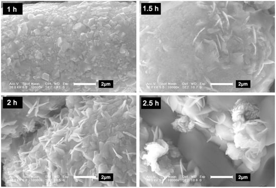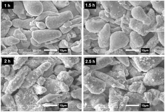 SEM images of parts sintered at holding times (magnified 10,000 times).