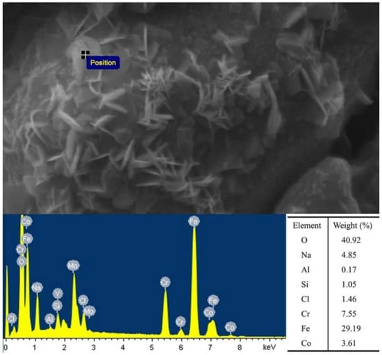 After sintering at the four holding times, the surfaces of the Fe-based metallic glass particles consisted of many crumb structures. The microscopic appearance of the particles’ surfaces under further magnification is shown in Figure 13. Fine grains were formed on the surfaces of the powder particles, and with increasing holding time, the grains became thin sheets and the number of grains increased. In addition, because of the grain growth, the distance between the powder particles increased, and the size of the sintered parts increased from a macroscopic viewpoint. Therefore, the sizes of the sintered parts increased. Figure 14 shows the energy dispersive spectrometry of the grains on the particle surface, which illustrated that Fe, Cr, and O elements were the key components. Since Figure 11 presented that the crystalline phases of the sintered parts were mainly Fe2O3 and Cr, the grains should be Fe2O3 and Cr crystals.