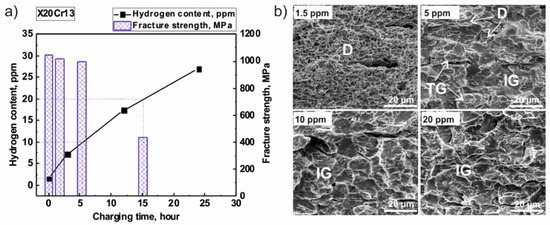 Figure 1 shows an example of hydrogen induced cracking in a cold rolled martensitic stainless steel X20Cr13 with the chemical composition 0.2% C and 13% Cr in weight percent. The material was pre-charged with hydrogen in 0.05 M HSO and 1.4 g/L Thiourea at the overpotential of −800 mV from 0–24 h to bring in different amounts of hydrogen into the material. Hydrogen charging was carried out with potentiostat High-Power 96 from Bank GmbH, Pohlheim, Germany . A Calomel electrode was used as a reference electrode and a platinum net was used as the counter electrode. Before charging, the specimen surfaces were ground sequentially from #320 to #800 SiC grit paper and finally polished with 6 m diamond paste on canvas. After charging, the material was stored in liquid N before hydrogen measurement by hot extraction with the hydrogen analysis equipment LECO RH402. Figure 1a shows the evolution of hydrogen contents according to the charging period. It reveals the material obtained as high as 27 ppm hydrogen after 24 h hydrogen charging. According to the Sievert’s law, the solid solubility of hydrogen in pure iron under hydrogen pressure of 100 bar at room temperature accounts for 2 × 10, which is extremely low compared to the amount of hydrogen measured in this experiment [23]. Therefore, it is assumed the oversaturated hydrogen due to the hydrogen charging is associated with hydrogen at dislocations and grain boundaries. Figure 1a also reveals the sharp reduction of fracture strength due to the charged hydrogen after a slow strain rate test at the strain rate of 10 s, which is reduced from 1046 MPa to 432 MPa when the amount of hydrogen is raised from 1.5 ppm to 20 ppm. Slow strain rate tests were performed with a constant extension machine from Zwick, Ulm, Germany, with a maximum load of 30 kN. The tensile specimens are in dog-bone shape with the geometry A25. Figure 1b illustrates the fracture surface from the failed slow strain rate specimens. The as delivered X20Cr13 has the initial hydrogen content of 1.5 ppm, which exhibits fully ductile (D) fracture feature with very fine dimple sizes. After charging with 5 ppm hydrogen, the fracture surface changes to mixed transgranular (TG) and intergranular (IG) cleavage and a few ductile islands. The cracks are propagating through the prior austenite grain boundaries as well as the martensite lath. By further increasing the charged hydrogen, the TG and IG fractures become more prominent. In association with the sharp reduction in fracture strength, the high amount of charged hydrogen is assumed to be accumulating at the prior austenite grain boundaries and reduces the grain boundary cohesion force.