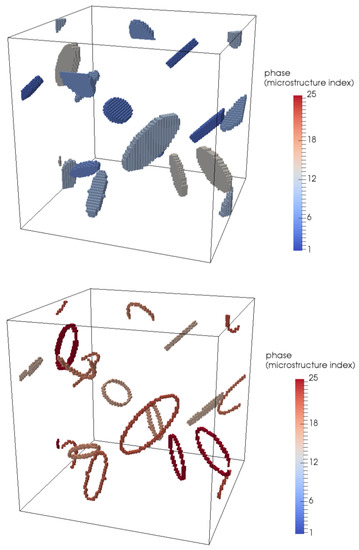 RVEs belong to the group of statistical approaches to achieve a representative homogenization of a material’s microstructure for a macroscopic model. For plasticity models, the varying quantity typically is the dislocation density. In Figure 2, an example of the RVE for a dislocation density of is shown. The dislocation density is given as , where N is the number of dislocations, d the circumference of the dislocation line, modeled as ellipse, and V the volume of the simulation box. The semi major-axis is labelled a, the semi minor-axis b. The dimensions of the dislocation lines are and , where here means that, for each individual dislocation line, a value from the interval is randomly added to the corresponding basic value of a and b. The dislocations are equally distributed on all 12 slip systems, i.e., on all 12 slip planes, only one dislocation is initially set, and the two additional dislocations are randomly distributed to a slip system. These dislocations are randomly positioned on the corresponding slip systems. Such an RVE thus includes 25 different microstructural phases, i.e., 12 phases enclosed by the dislocations, the 12 dislocations and the matrix phase.