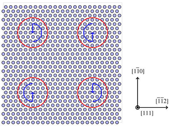 Schematic images of the quadrupole dislocation construction used in the simulation. The blue arrows indicate the helicity of the dislocations, with “up” and “down” arrows corresponding to screw dislocations of Burgers vectors and , respectively. The red circles indicate the effective binding range.