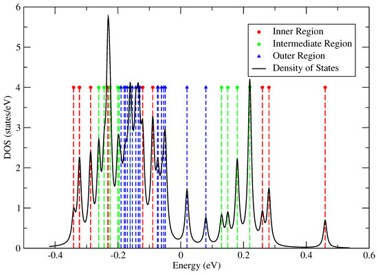 Each vertical line corresponds to one data point (due to symmetry, some points overlap). The colors correspond to the distances from the dislocation core, measured by the radius R. The red circles correspond to the 24 points closest to the dislocation core (R < 2.87 Å), the green squares are in the “intermediate range” (2.87 Å < R < 4.04 Å), with the blue points belong are the outermost 24 points. The density of states (DOS) curve is generated by broadening the delta functions by a Lorentzian function of width kT/2 (T = 300 K), with the integral under the DOS curve being normalised to 1.