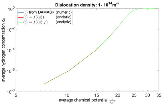 Here, is the volume fraction of the dislocation cores and the volume fraction of the bulk, which are defined as and , whereby describes the radius of the dislocation core and, therefore, describes the cross-sectional area of the dislocation line. The system is described in a stationary state , and mechanical contributions are neglected. Equality of the chemical potentials then provides expression for the concentration for the bulk and the dislocations as and where we can, based on the calculations in Section 3.3, set .